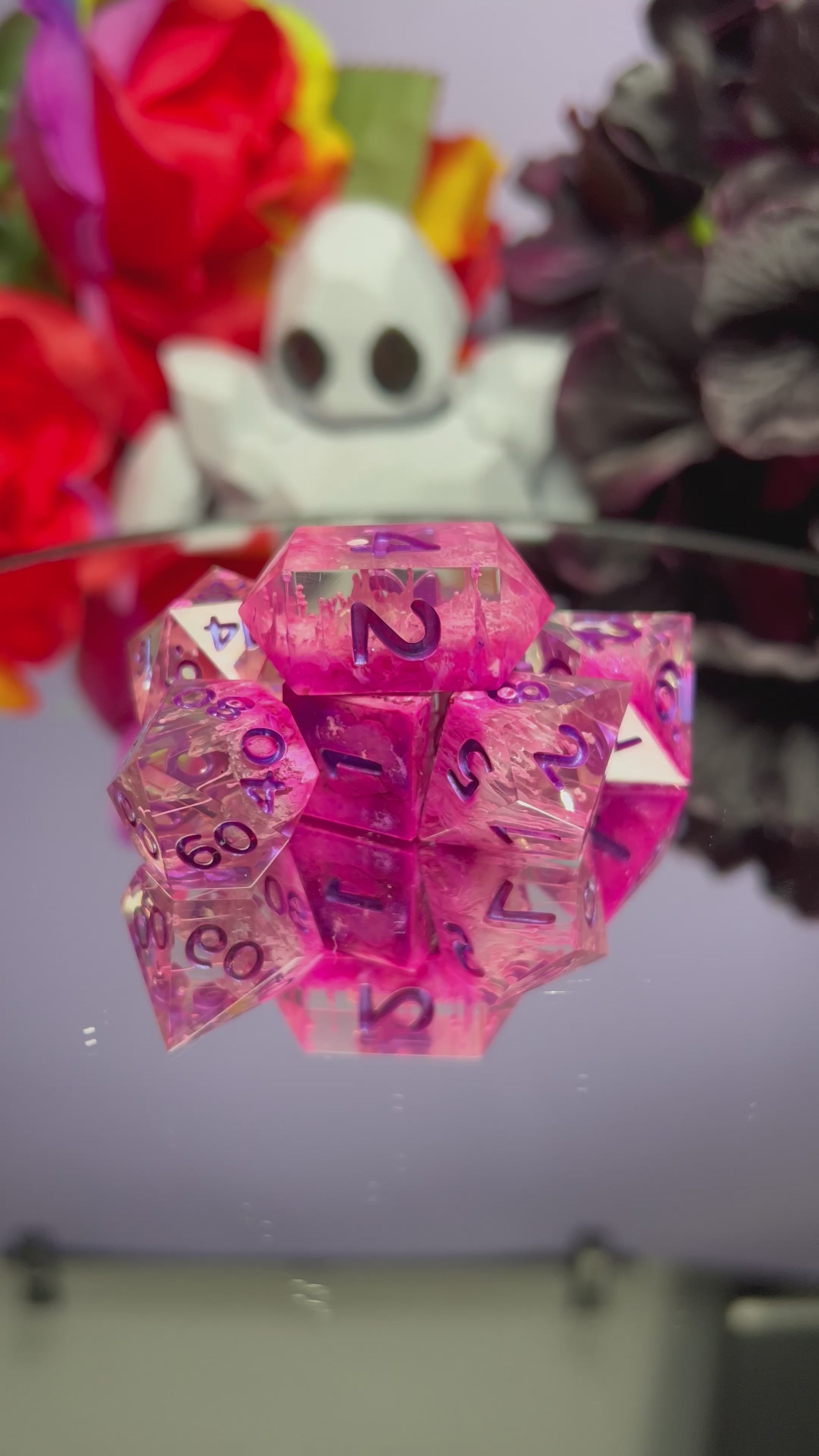 This Standard 7 Set Dice - Spores of Aphrodite features clear dice with spore like tendrils of pink stretching through the dice. The numbers are painted with purple. Handmade with impeccable attention to detail, this set is sure to elevate any RPG game. Includes all the dice necessary for most standard tabletop games!