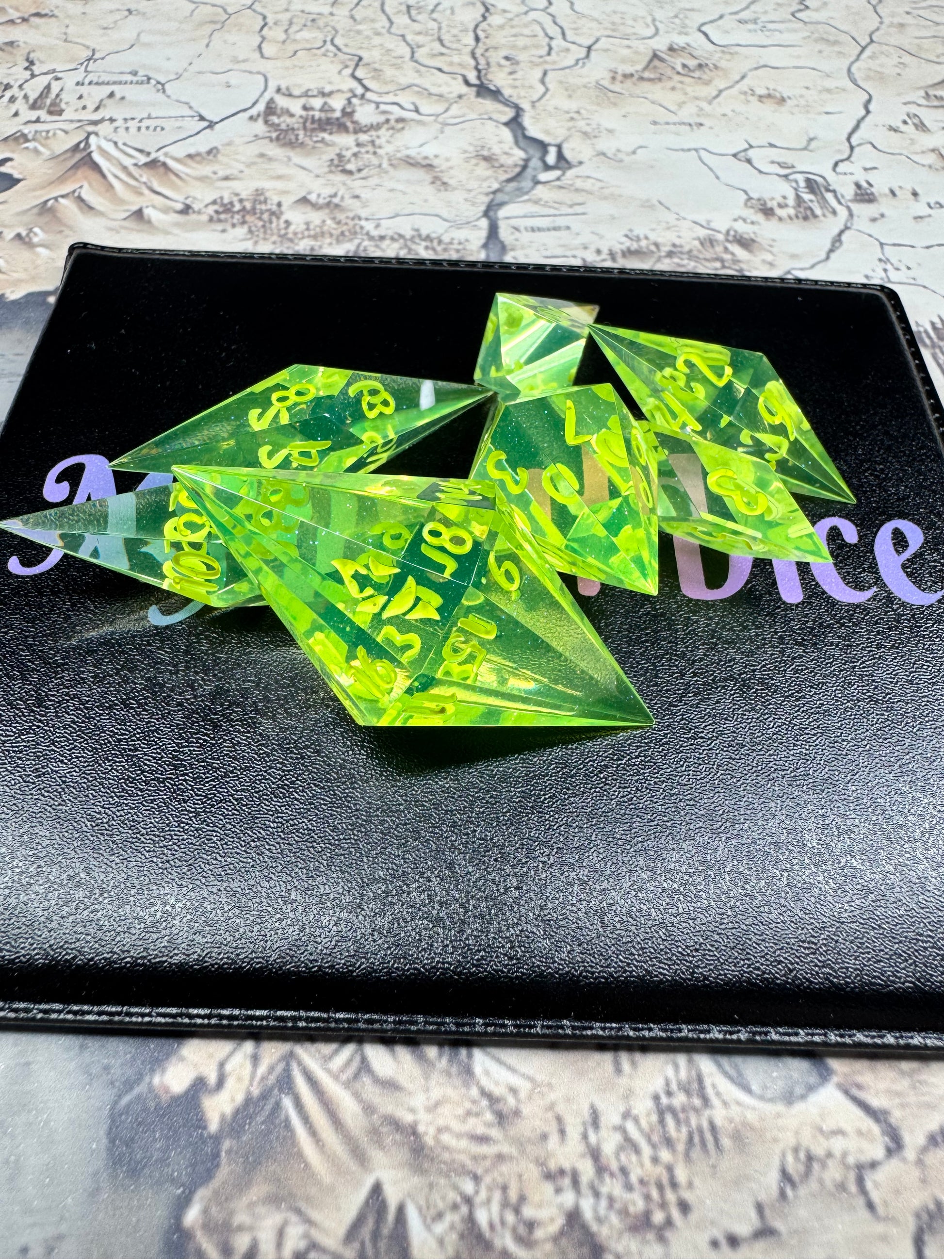 This Standard 7 Set Dice - Uranium set features fluorescent green crystal style dice. Painted with bright green numbers. The fluorescent colors make it glow like Uranium Glass! Handmade with impeccable attention to detail, this set is sure to elevate any RPG game. Includes all the dice necessary for most standard tabletop games!